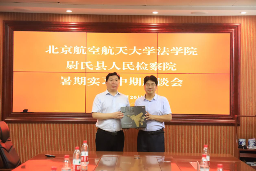 座谈会结束后,周友军书记代表北航法学院向尉氏县人民检察院送出北航航空模型纪念品。