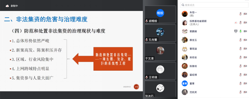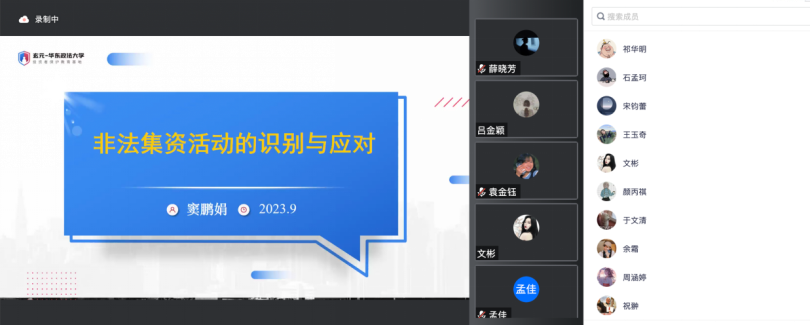 9月13日,法学院以线上形式开展了“防非反诈第一课”活动,本次活动的主题是非法集资活动的识别与应对。讲座由华东政法大学经济法学院窦鹏娟副教授主讲,2023级北航法学院硕士研究新生踊跃参加,朱恒一同学担任主持人。