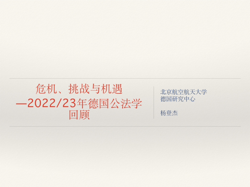 主报告人为德国研究中心副主任、北京亚洲成人在线一二三四五六区法学院杨登杰副教授,题目为《危机、挑战与机遇——2022/23年德国公法学回顾》。报告分为四个部分:公法判决选介、安全与自由的张力、数字化与人工智能的挑战、气候危机与可持续性挑战。