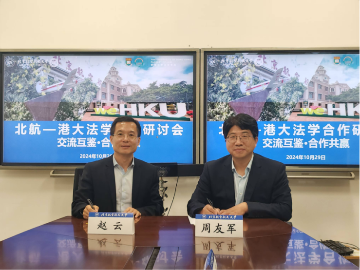 会议伊始,双方共同回顾了北航法学院与香港大学法律学院之间的学术交流与合作历程,对彼此高效而优质的互动协作表示了肯定。紧接着,赵云教授与周友军教授分别介绍了香港大学法律学院及北航法学院的创建背景、发展轨迹和目前的发展态势,并就两院的架构体系、团队组成、教学理念、研究特色等维度进行了深入的比较分析。香港大学法律学院以其国际化程度和学术地位著称,而北航法学院在信息化、工业化、技术化、智能化等领域的专业研究亦具有显著影响力,这些构成了双方合作的坚实基础。为了进一步推动两院在法学教育资源的整合、师生互访以及学术交流等领域的合作,双方签署了北航法学院与香港大学法律学院的合作谅解备忘录。