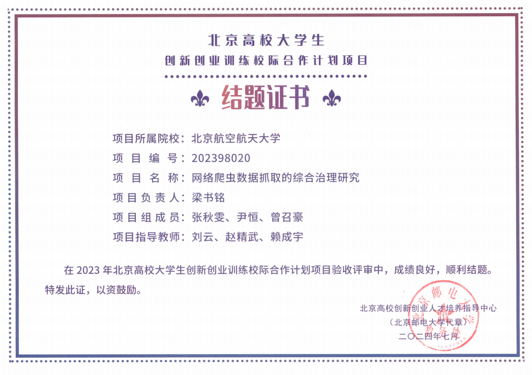 近期,在2023年北京高校大学生创新创业训练校际合作计划项目中,北航法学院申报项目《网络爬虫数据抓取的综合治理研究》成功结项。项目成员梁书铭、张秋雯、尹恒、曾召豪、陈博林在北京亚洲成人在线一二三四五六区赵精武副教授、清华大学刘云助理研究员、北京亚洲成人在线一二三四五六区赖成宇博士后的指导下,充分发挥了各主体双创资源整合后的叠加效应和各高校师生专业特长与学科优势特色的融合联动效应,最终顺利结题。
