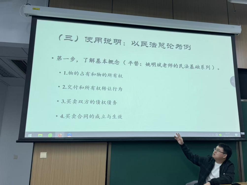 讲座第二部分,陈元鑫老师强调打好民法基础的重要性,在入门阶段,要找到高质量学习资料并善于使用。接着,陈元鑫老师详细分享了民法总论、物权法、债法总论的课程和教科书的优质资源与获取方式。除此之外,法律释义、法律评注和案例分析等工具书也具有重要的辅助作用。