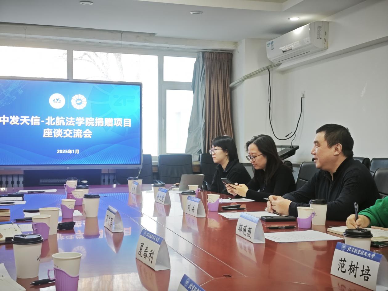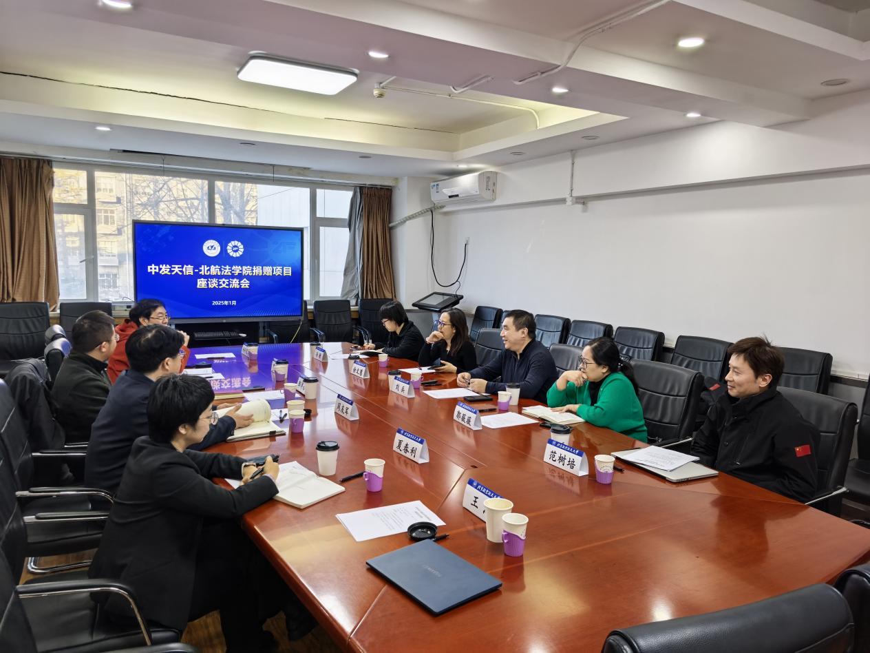 1月7日下午,中发天信-北航法学院捐赠项目座谈交流会在北航如心楼206会议室举行。中发天信公司总经理刘兵、法务部郭薇薇、国际部余文慧、企发中心范树培、孙珊、法学院党委书记周友军、党委副书记邹沛东、国际法研究中心主任夏春利副教授、副主任高国柱教授、杨彩霞副教授、党政办主任王江出席座谈交流会。交流会由法学院党委书记周友军主持。