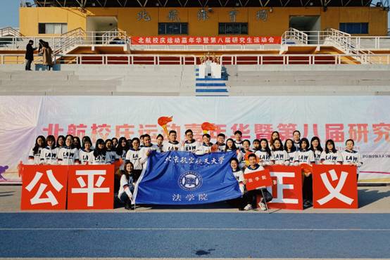 法学院方阵选取火炬为道具,象征运动员激情似火的昂扬斗志和赛场上接力传承的体育精神;方阵队员高举“公平”、“正义”展示牌,体现航法学子为法治事业贡献力量的庄严决心;方阵以“方圆成法、严谨自律、凌云赛场、尽显锋芒”为口号,表现出方阵队员既肩负法治使命,又全力驰骋赛场的壮志。