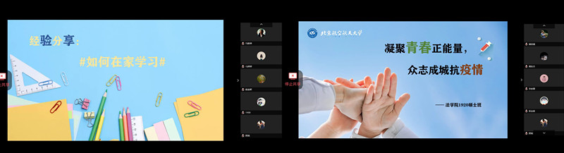 校历第5周,法学院本研学生共开展7场“学习日”活动,其中大班会3场、小班会4场。总计应到会295人,实到会278人。活动开展前进行了集体备课。各年级围绕疫情防控先进事迹学习、疫情中的法律问题分析、线上学习方法交流、求职方法指导和心理健康建设等内容开展活动。