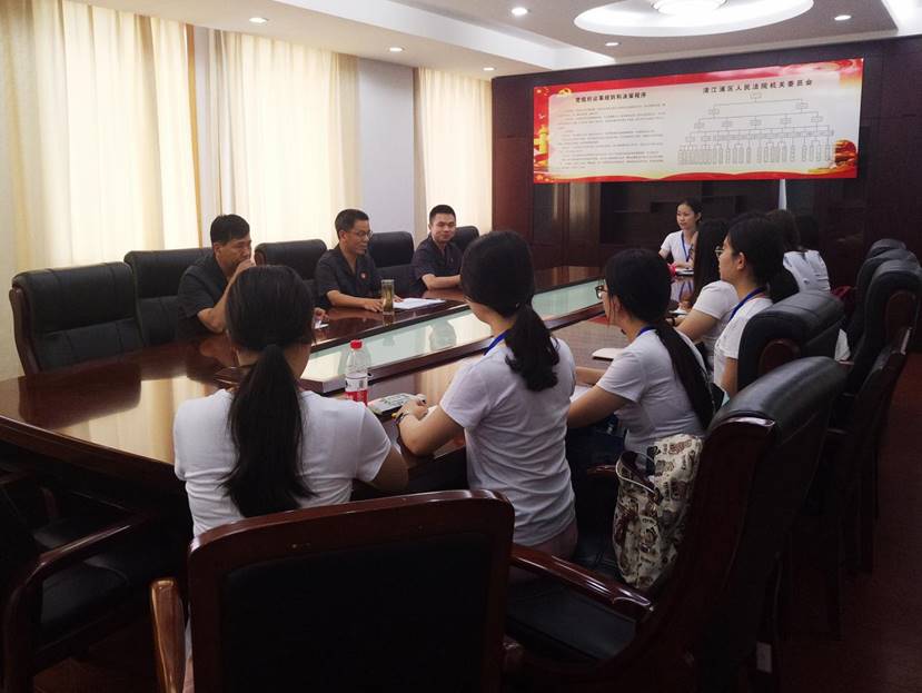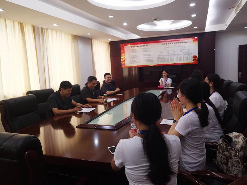 院党组成员、政治处主任王炳连、人事科科长蒋兴忠以及蒋同一主任亲切地接待了同学们,并由王炳连主任主持召开了迎接座谈会。会上,王炳连主任对同学们的到来表示欢迎,首先介绍了淮安地区的风土人情,其后对法院概况也做了简要展示:淮安市清江浦区法院由淮安市清河法院和淮安市清浦法院合并而成,拥有二十余个部门,在编行政人员202名左右,还拥有一大批聘任制的书记员,总共350名左右,处理的案件多达两万多起,其中民商事案件较多。