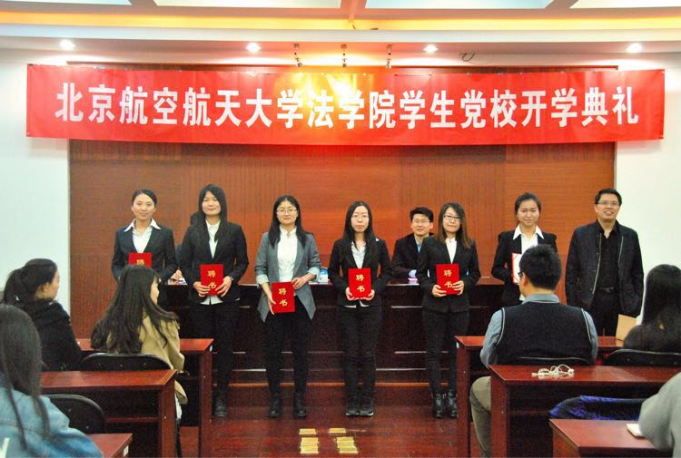 大会第一项,主持人宣布北航法学院学生党校开学典礼正式开始,全体成员起立奏唱《国歌》。首先,由分党委副书记宋晓东宣布法学院学生党校本届干部聘任名单,之后分党委书记王琪全分别为六名学生党校干部颁发聘书。随后,学员代表麻瑞祯发言,表达了新一代共产党员“无私奉献”的精神,号召学生党员认真完成党校课程,积极投身实践服务;干部代表程凌发言,介绍了法学院学生党校的学习内容及组织机构设置,并表达了做好学生党校工作,全心全意为学生党校师生服务的自我要求。