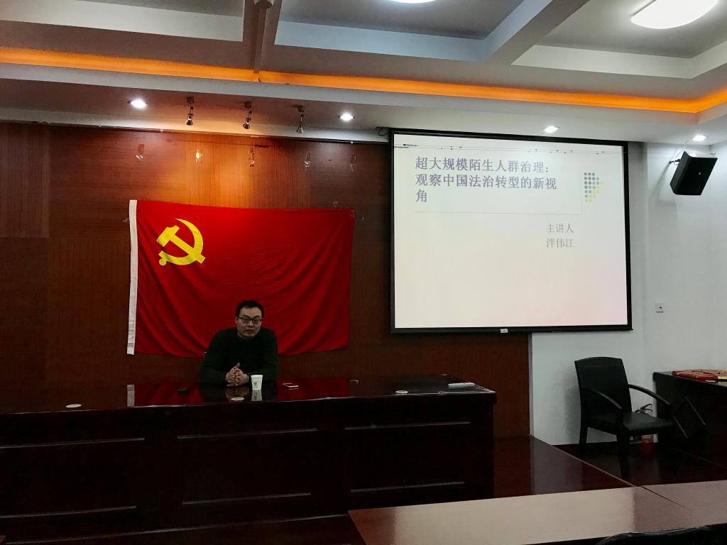泮老师作为学识渊博的法理学者,他对法社会学领域有着深入的研究,针对目前我国依法治国,完善社会主义法治建设的现实,泮老师指导我们从陌生人、陌生社会新角度来思考我们的社会。课上,泮老师从四个概念出发:“什么是陌生人?什么是陌生人社会?什么是大规模陌生社会?什么是超大规模陌生人社会?”,接着从理论层面对此作了一一解答。他提到,目前中国已经进入了超大规模陌生人群时代,针对这样一个新兴时代,爆发了许多新的现实问题,需要我们用法治的思维去一一探讨。泮老师提到学生党员,作为学生中的先进分子,将来也是这个社会的先进分子,更应该对这个社会产生的新变化加以关注,以便将来可以更好的了解适应这个社会。这也是学生党员保持自身先进性的必然要求。课后,学生党员纷纷表示这节党课对自己产生了很大的启发,在今后的学习工作中,要多关注社会的发展,将自己培养成复合型人才,时刻保持先进性。
