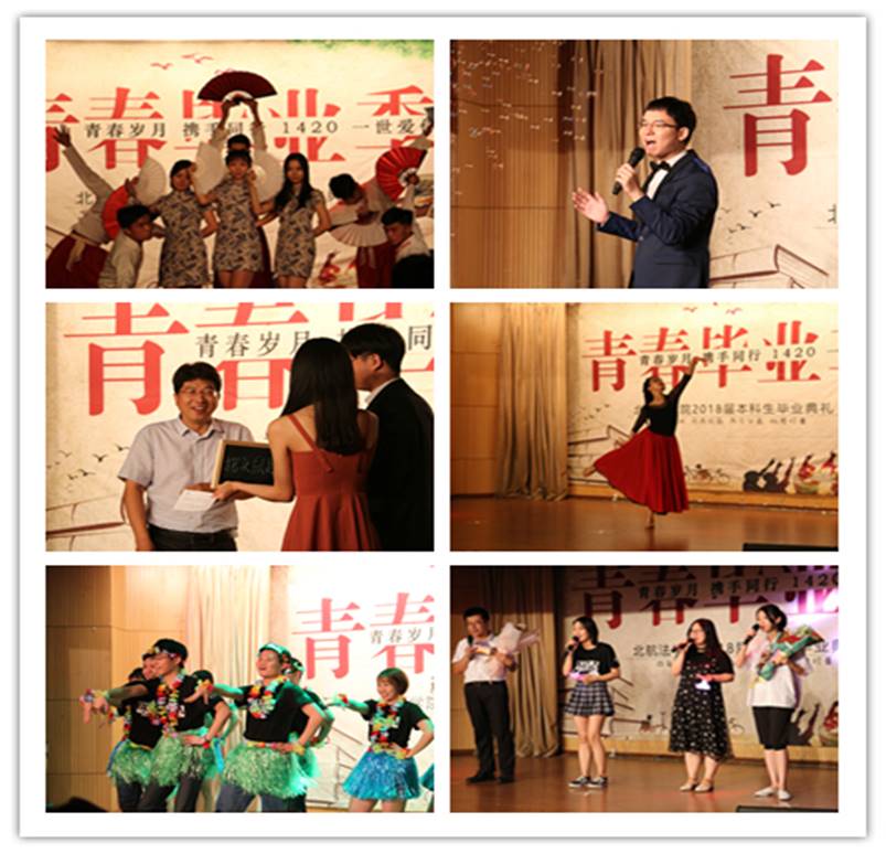 接下来,毕业晚会精彩纷呈的节目依次上演。精心制作的毕业纪念视频,勾起了同学们对于本科生活的温馨回忆。由北航扇舞团表演的舞蹈《惊蛰》,灵动的舞姿迎来满场喝彩。法学院刘颖老师演唱了歌曲《小幸运》,用歌声对毕业生与北航法学院四年的美好相遇表达深远的祝福。轻松幽默的游戏环节中,师生先后登台,将晚会现场推向了又一个高潮。2016级本科生派出由柳依青等同学组成的和玹合唱团演绎了一曲《梨花又开放》,法学院2014级研究生李普学姐舞动一曲《蕃社姑娘》,婉转的歌声与曼妙的舞姿,尽情传递了法学院全体师生对毕业生们的祝愿。法学院毕洪海老师、初殿清老师,与2018届本科生李天琦、刘珊合作,带来一组师生歌曲联唱,二位老师的组合还饱含着“毕业亦是新的开始”的美好寓意。法学院那仁托娅等18位本科毕业生,重新编排并上演了大三学年曾参加大学生艺术展演的舞蹈《舞动青春》,充满青春活力的舞姿为毕业晚会画上了圆满的句号。伴随着《青春纪念册》的旋律,全体演职人员与观众登台谢幕并合影留念。