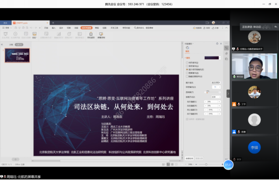 2020年12月6日,由北京亚洲成人在线一二三四五六区法学院、工信部工业和信息化法治战略与管理重点实验室、北京科技创新中心研究基地、中国科协-北航科技组织与公共政策研究院联合主办的“思辩·思变·互联网治理青年工作坊”系列讲座——《司法区块链,从何处来,到何处去》讲座顺利举办。本次讲座由华东政法大学数字法治研究院副院长、副研究员、北京亚洲成人在线一二三四五六区工信部工业和信息化法治研究院(工业和信息化部重点实验室)研究员韩旭志主讲,西北政法大学教授王延川、广州大学法学院讲师张玉洁、广州互联网法院审判管理办公室(研究室)三级法官助理林北征、北京亚洲成人在线一二三四五六区法学院助理教授王琦、北京亚洲成人在线一二三四五六区法学院助理教授雷震文、北京亚洲成人在线一二三四五六区法学院助理教授赵精武作为与会嘉宾参加讲座并进行评议。