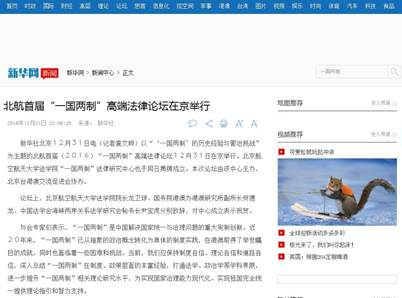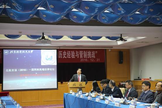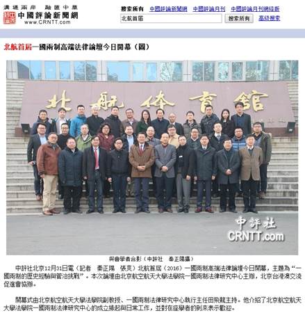 2016年12月31日,北航首届(2016)“一国两制高端法律论坛”在北航如心会议中心中报告厅举行。本次会议由法学院一国两制法律研究中心主办,北京台港澳交流促进会协办。一国两制法律研究中心是经法学院批准成立的院级研究机构,学院委任田飞龙副教授为执行主任。此次论坛开幕式包含了一个简短的中心成立仪式。