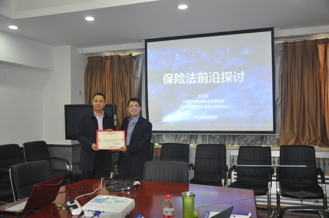 研讨会之初,王琪全书记向姚军博士和刘学生副局长颁发亚太保险法研究中心高级研究员的聘书。